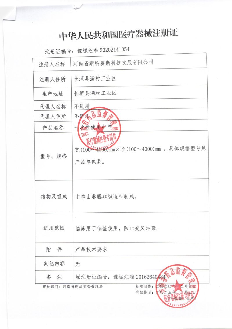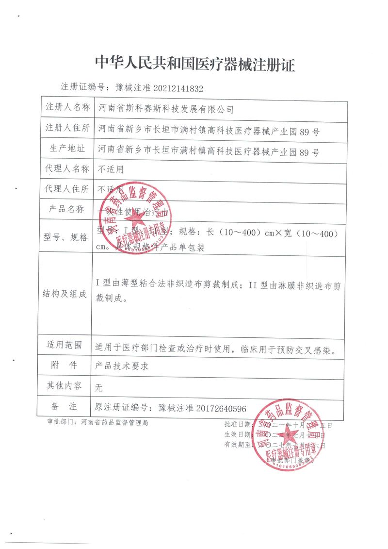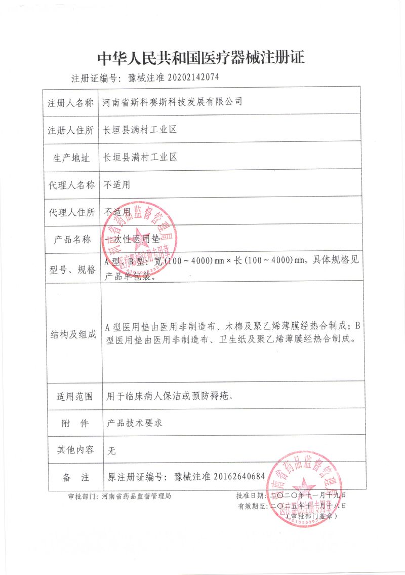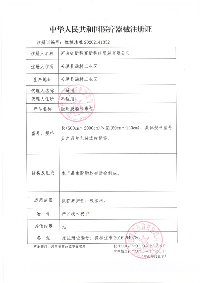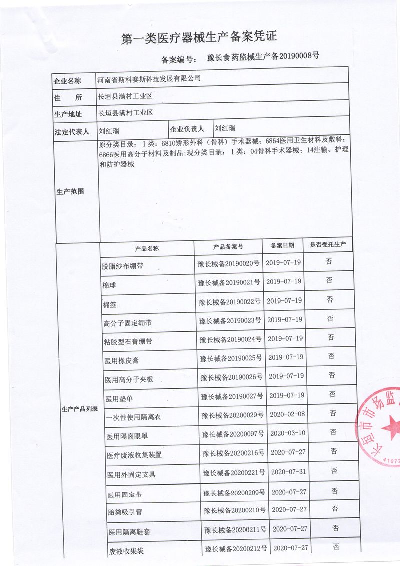 河南省斯科賽斯科技發(fā)展有限公司創(chuàng)建于 2011 年,位于“中國醫(yī)療耗材之都”- 河南省長垣縣,西臨 308 省道,南靠新菏鐵路,北依長濟高速,交通便捷,經濟發(fā)達,環(huán)境優(yōu)美。斯科賽斯積極進入醫(yī)療健康和服務領域,秉承為用戶創(chuàng)造價值的理念,專注于醫(yī)用耗材解決方案的研發(fā)和運營,并為用戶提供完善的產品解決方案;  斯科賽斯主要生產醫(yī)用麻醉系列、醫(yī)用高分子系列、醫(yī)用敷料包系列、醫(yī)用無紡布系列、醫(yī)用防護系列、醫(yī)用脫脂棉系列、生物材料制品類等七大類、100 多個品種、400 多個規(guī)格的產品。公司占地面積約 30000 平方米,建筑面積20000 平方米,擁有 10 萬級的凈化車間總面積 10000 平方米。擁有國際先進水平的生產設備和檢測儀器,技術裝備精良,檢測手段完善,為醫(yī)療行業(yè)的不斷發(fā)展進步提供保障。公司順利通過 ISO9001、ISO13485 質量管理體系認證。  斯科賽斯堅持研發(fā)高科技新產品,力爭在醫(yī)療器械關鍵領域取得技術和研發(fā)的重大突破;立足國內和國際兩個市場,逐步實現(xiàn)管理理念、經營機制、人力資源、技術、產品、市場等全方位對接,提高企業(yè)的核心競爭力;過去的歲月里,斯科賽斯砥礪前行,誠信務實,銳意進取,不斷創(chuàng)新,用自己的睿智和辛勞,以富有責任感的使命,在探索中追求,在追求中超越,致力于成為值得信賴的醫(yī)療用品生產企業(yè)!在未來的日子里,斯科賽斯將一如既往豪情滿懷,信心百倍,攜手并肩,執(zhí)著追求,向更高的的目標前進,鑄造新的輝煌!